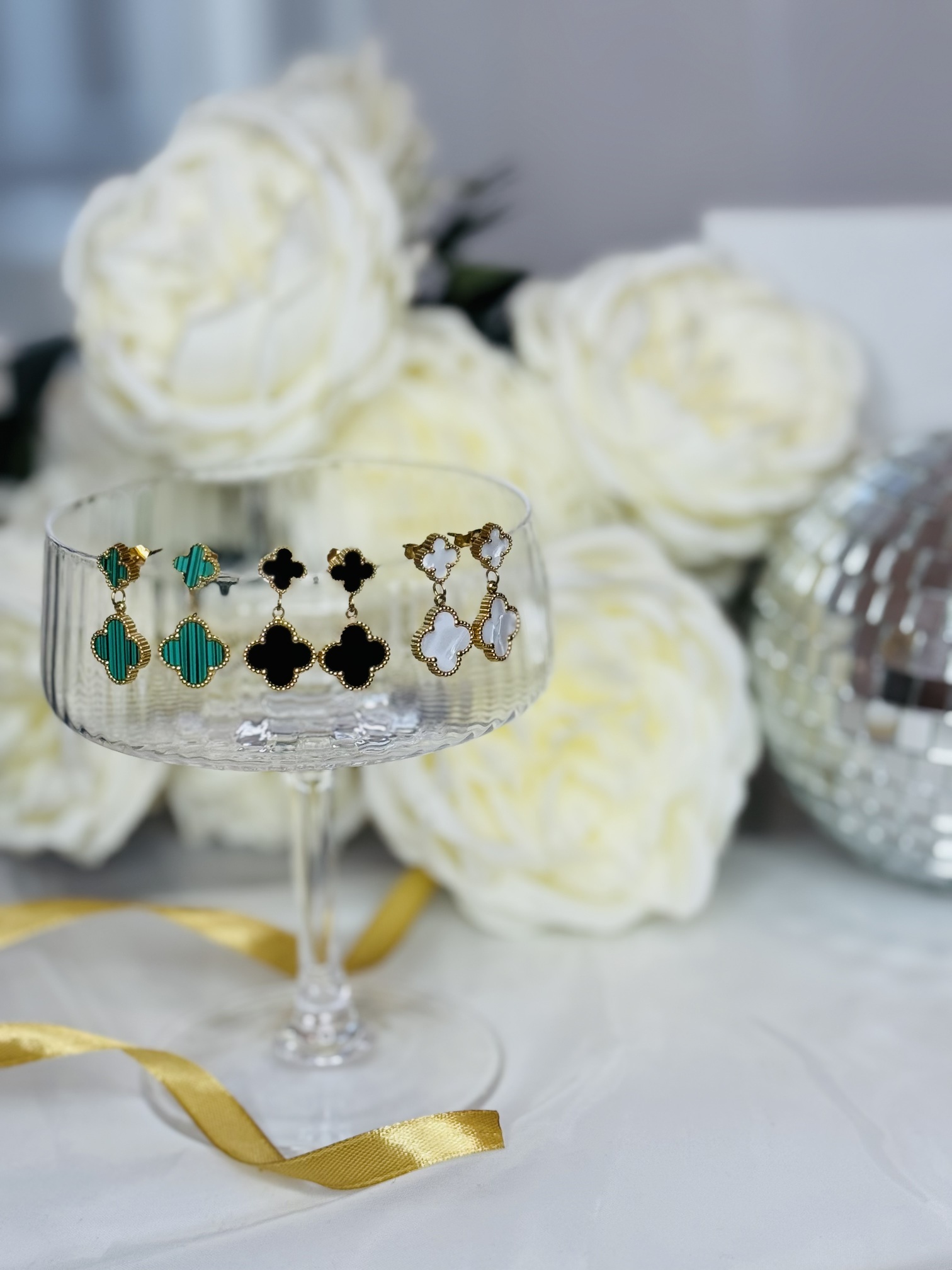 Kolczyki z jasną koniczyną w złotej oprawie. Delikatne, kobiece i idealne do eleganckich oraz codziennych stylizacji. Sprawdzą się zarówno solo, jak i w komplecie.